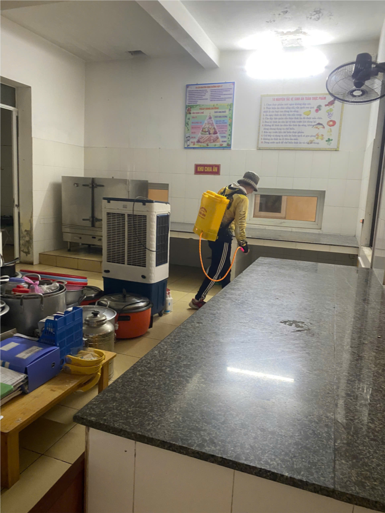 Toàn bộ khuôn viên trường, bao gồm lớp học, hành lang, sân chơi, nhà vệ sinh và các khu vực xung quanh đều được phun thuốc theo đúng quy trình an toàn, đảm bảo không ảnh hưởng đến sức khỏe của trẻ và cán bộ giáo viên. Trước và sau khi phun thuốc, nhà trường cũng thực hiện vệ sinh, lau dọn lớp học để đảm bảo môi trường luôn sạch sẽ, thông thoáng.